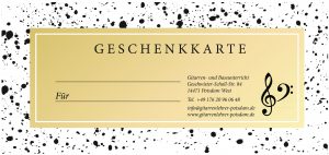 Falls Sie den Gitarren- bzw. Bassunterricht als Gutschein verschenken möchten, kann ich Ihnen entweder einen fertig gestalteten und ausgefüllten Gutschein zukommen lassen, oder Sie können den Gutschein persönlich gestalten – dieser ist dann auch ohne meine Unterschrift oder sonstige Formalitäten gültig. Zur Sicherheit bekommen Sie aber selbstverständlich eine Quittung von mir.