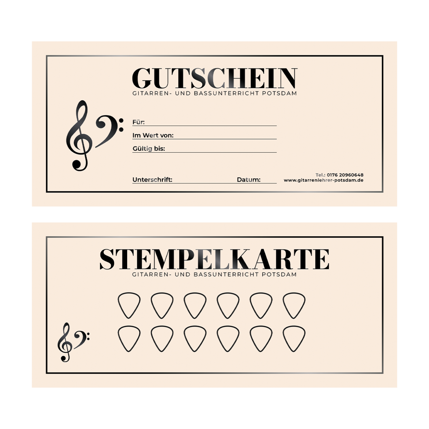 Falls Sie den Gitarren- bzw. Bassunterricht als Gutschein verschenken möchten, kann ich Ihnen entweder einen fertig gestalteten und ausgefüllten Gutschein zukommen lassen, oder Sie können den Gutschein persönlich gestalten – dieser ist dann auch ohne meine Unterschrift oder sonstige Formalitäten gültig. Zur Sicherheit bekommen Sie aber selbstverständlich eine Quittung von mir.